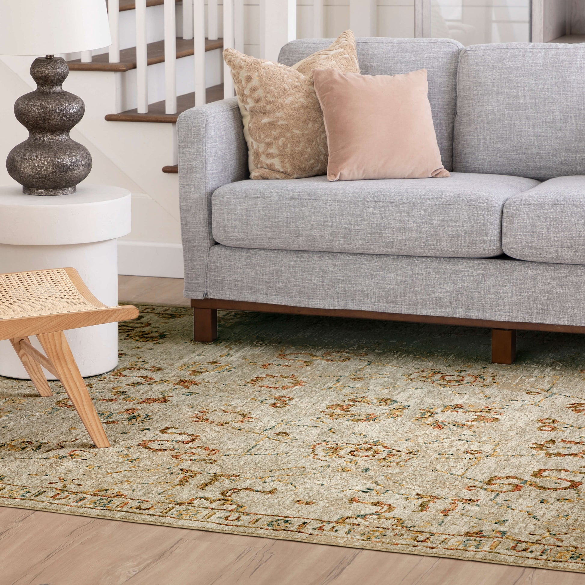 This stunning Memento Collection by Karastan Rugs is the perfect statement of sophistication for any room in the home. Its velvety cut pile is highly textural and richly colored in a modern palette of sand splashed with olive green, rust red, grey, ivory and gold. Space dyed, 8MM pile height with an assortment of distressed designs to choose from including ornate and wispy clouds of cross-hatched linear pattern.