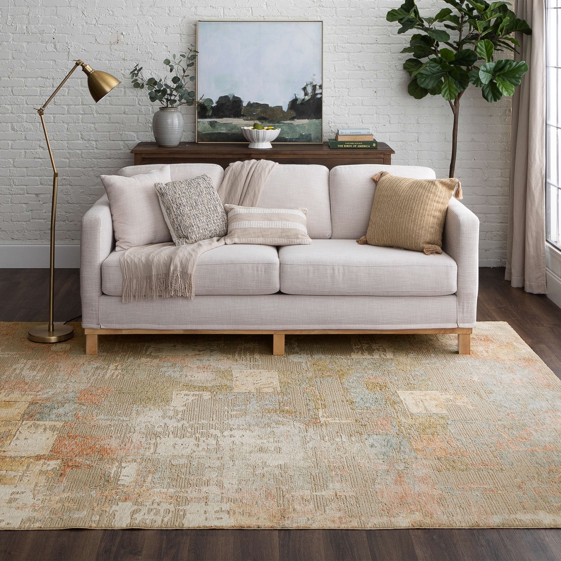 This stunning Memento Collection by Karastan Rugs is the perfect statement of sophistication for any room in the home. Its velvety cut pile is highly textural and richly colored in a modern palette of sand splashed with olive green, rust red, grey, ivory and gold. Space dyed, 8MM pile height with an assortment of distressed designs to choose from including ornate and wispy clouds of cross-hatched linear pattern.