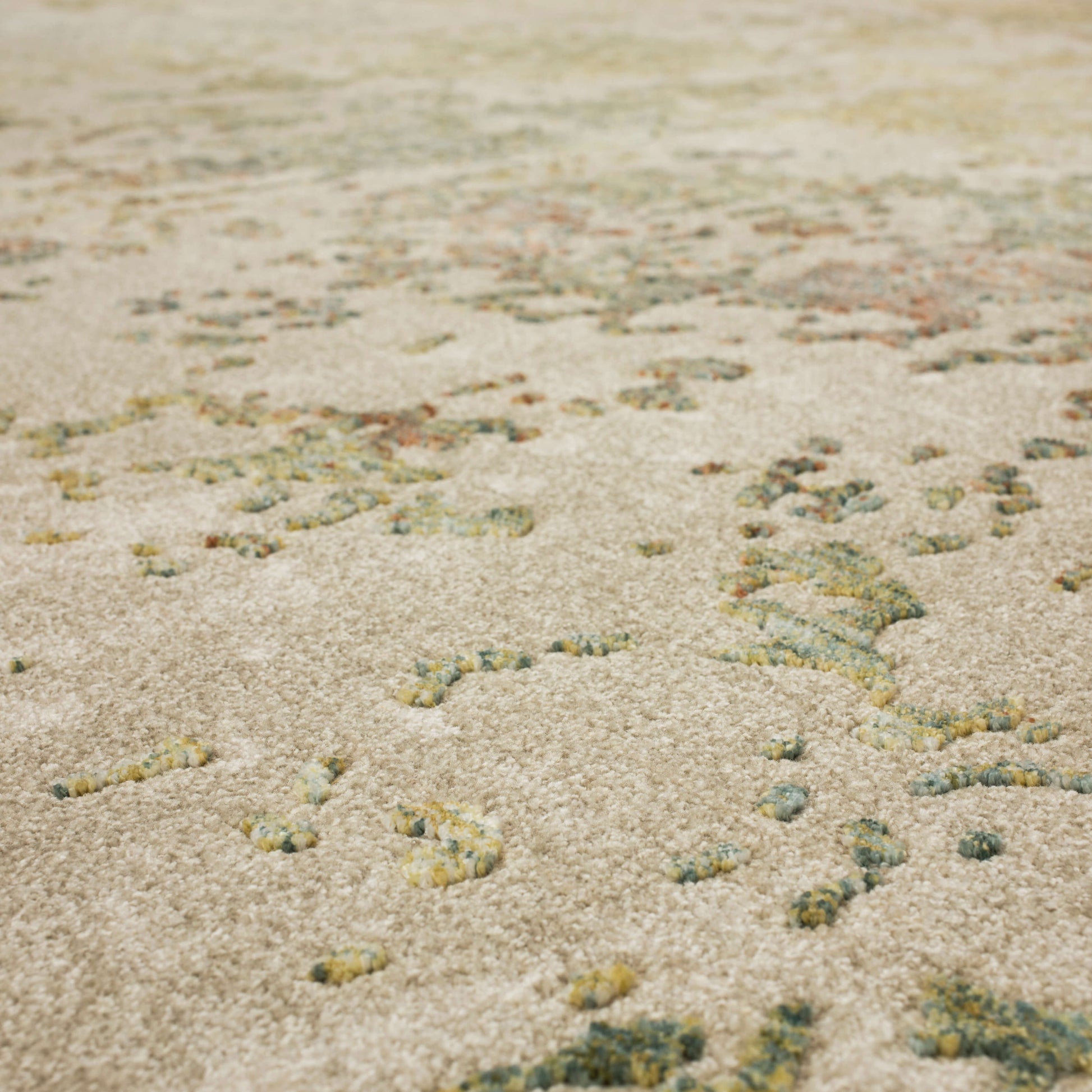 This stunning Memento Collection by Karastan Rugs is the perfect statement of sophistication for any room in the home. Its velvety cut pile is highly textural and richly colored in a modern palette of sand splashed with olive green, rust red, grey, ivory and gold. Space dyed, 8MM pile height with an assortment of distressed designs to choose from including ornate and wispy clouds of cross-hatched linear pattern.